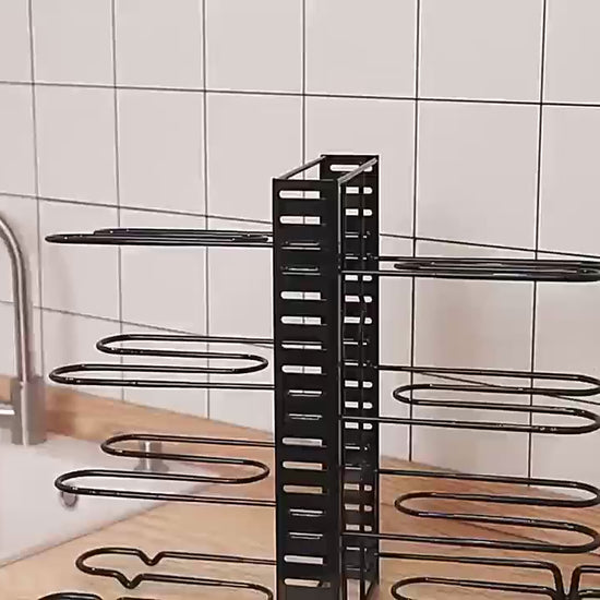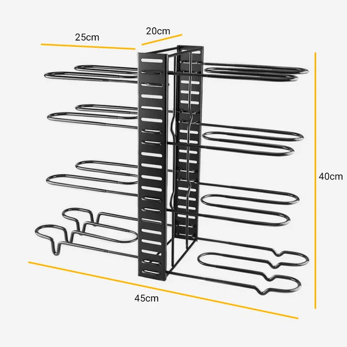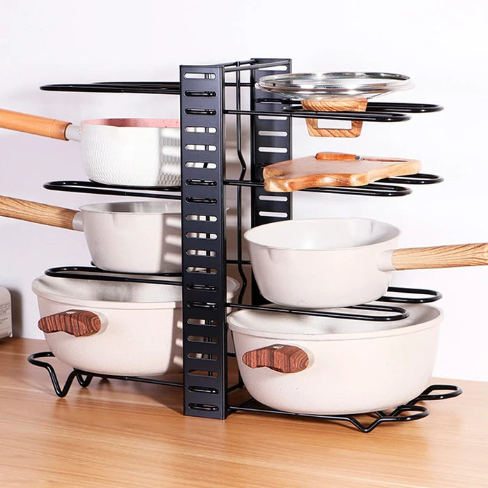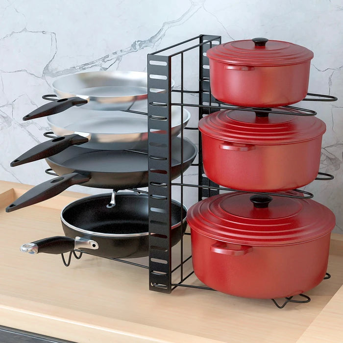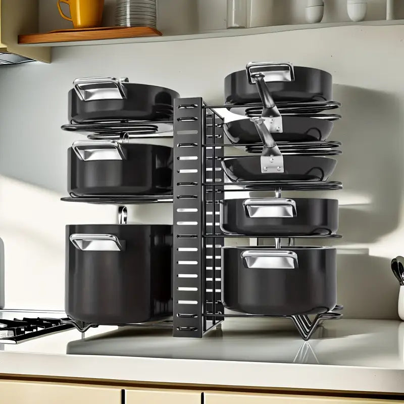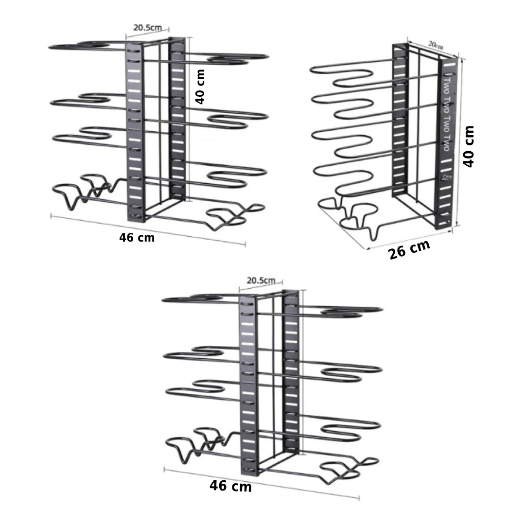 Presentamos nuestro Organizador de Ollas y Sartenes con 3 modos de uso y 8 niveles ajustables. Con estantes verticales, horizontales o planos en dos lados, y ranuras especiales en “U” para las tapas, este organizador se adapta a tu cocina. Fabricado en metal resistente que no se deforma ni oxida, soporta desde ollas grandes hasta utensilios más pequeños, manteniéndolos protegidos y accesibles. Armado fácil, estructura estable y acabado pensado para durar.